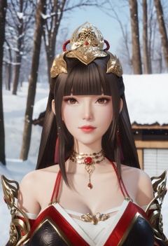 (score_9),realistic,looking at viewer,front view,<lora:幽亦寒-apony-000009:0.8>,youyihan,1girl,solo,long hair,dark brown hair,blunt bangs,hair ornament,tassel earrings,brown eyes,bare shoulders,shoulder armor,red gem,japanese clothes,necklace,detached sleeves,wide sleeves,obi,waist belt,(glamor:1.2),(mature_female),collarbone,BREAKgame cg,in winter,snow,ice,4K ultra HD,high detail,high contrast,depth of field,