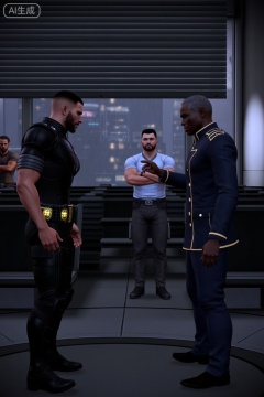 A scene from the video game Mass Effect. In a dimly lit, futuristic space station corridor that doubles as a grand office area, two men are arguing intensely. The man on the left has short dark hair, a beard, and wears a black tactical suit with gold accents and a glowing waist device. The man on the right, an older Black man, sports a dark blue uniform with gold trim and epaulets, pointing confrontationaly. Behind them, a muscular bodyguard in a light blue short-sleeve shirt and dark pants stands with arms crossed. Another figure in dark clothing is partially visible in the background. Rows of black benches and a large window with blinds reveal a rainy, futuristic urban landscape outside. The atmosphere is tense and dramatic, capturing a pivotal narrative moment.