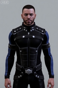 1man,3D,Game NPC characters,solo,manly, The picture shows a man wearing a futuristic battle suit. His clothing is mainly black, and the material looks tough and protective, appearing to be some kind of high-tech synthetic material. The clothing is dotted with multiple silver round parts, which may be used to secure other equipment or function as functional operation buttons. The shoulders and chest are equipped with wide black straps. These straps not only add layering and toughness to the clothing, but may also protect key parts of the body. The sleeves are decorated with blue lines, which contrast sharply with the black main body, making the overall shape more visually impactful. This combat uniform perfectly fits the style of combatants in science fiction themes, showing a sense of technology and power.