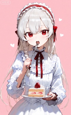 1girl, food, strawberry, fruit, braid, cake, strawberry shortcake, solo, red eyes, fork, plate, lolita hairband, cake slice, holding, white hair, blush, long hair, holding fork, holding plate, looking at viewer, dress, red nails, lolita fashion, open mouth, bow, nail polish, upper body, ribbon, eating, hairband, white dress, single braid, red bow, long sleeves, frills, red ribbon, hair bow, pink background