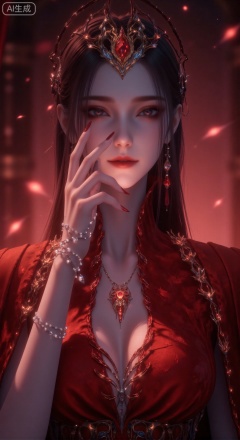 (masterpiece, best quality, ultra-detailed, 8k resolution, sharp focus), an enchanting Eastern-style woman with a flawless face, dramatic eye makeup with glitter, and full, vibrant lips. Her gaze is alluring and mysterious. She gently touches her cheek with the long, sharp nails of one hand, wearing a multi-strand pearl bracelet on her wrist. An elaborate golden and black headdress adorns her head, with sleek black hair flowing down. She is dressed in a luminous red silk gown with a low neckline, accessorized with a delicate necklace featuring a unique spider or flame-shaped pendant. The background is a blur of warm-toned light and shadow, dominated by deep reds and purples, creating a hazy, dreamlike atmosphere. Centered composition. Dramatic lighting focuses on her face, shoulders, and jewelry, highlighting her expression and opulent details. Neo-Chinese aesthetic, concept art, highly detailed, cinematic lighting, trending on ArtStation.