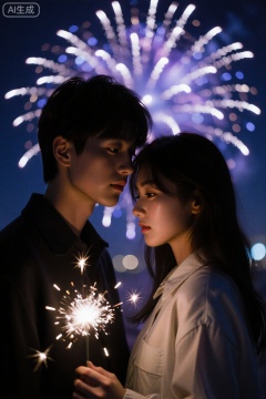 视觉语言:烟花放射状线条与人物依偎轮廓形成几何对比。技术参数:尼康Z9配70-200mm镜头,f/11小光圈捕捉烟花细节,1/125s冻结飞散火花。艺术表达:蓝紫色烟花冷光与人物暖肤色调冲突,隐喻"热闹中的疏离"情感。