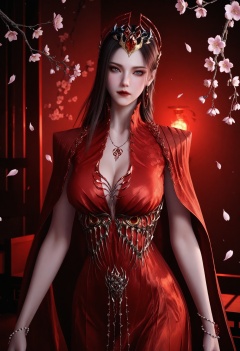 (looking at viewer:1.1),upper body,(Dark room:1.3),(moody lighting:1.1),peach blossom,falling petals,(large breasts:0.8),yexishui,1girl,solo,long hair,jewelry,red dress,dress,brown hair,closed mouth,realistic,hair ornament,earrings,cape,grey eyes,necklace,bracelet,red lips,high heels BREAK masterpiece,(best quality),(intricate details:0.9),(realistic skin:1.2),<lora:QQSillyexishuiV1:0.8>,