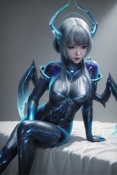 masterpiece,best quality,realistic,cinematic,detail eyes,(ultra-detailed),perfect composition,intricate details,absurdres,detailed face,high quality,high res,8K,<lora:X_babata_IL3.0:0.8>,grey hair,grey eyes,1girl,horns,long hair,breast,medium breast,hair_ornament,bodysuit,wings,sitting,simple background,bed,