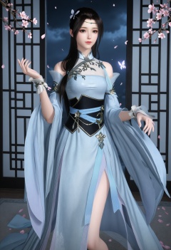 (full_body:1.2),(looking at viewer:1.1),masterpiece,(best quality),smog,Dark room,dim lighting,peach blossom,falling petals,<lora:YQ_Illustrious光辉v5_叶雪青_V1:0.8>,q1528437228,1girl,solo,long hair,black hair,dress,hair ornament,white dress,chinese clothes,detached sleeves,sash,butterfly hair ornament,jewelry,brown hair,bracelet,circlet,black eyes,wide sleeves,long sleeves,obi,white footwear,