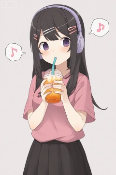 egtachie01,1girl,black hair,black skirt,blush,drink,drinking,drinking straw,eighth note,hair ornament,hairclip,headphones,holding,holding drink,long hair,musical note,pink shirt,purple eyes,shirt,short sleeves,skirt,solo,spoken musical note,upper body,