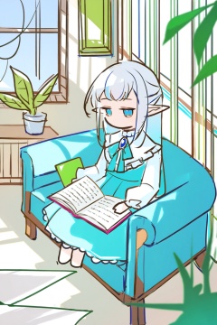 sketches,1girl,elf,chibi,long hair,silver hair,blue gradient hair,pure bangs,blue eyes,small chest,blue brooch,frilled_shirt,long_sleeves,dress,sitting,looking at the audience,half-closed eyes,holding books,window_,curtains,plant,flower,book,team,chair,couch,open books,paper,masterpieces,best quality,art,onnk,lines,line style,depth of field,(color),