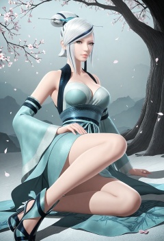 (looking at viewer:1.1),(moody lighting:1.1),in winter,falling petals,intense shadows,(large breasts:0.8),xiaomeng,1girl,solo,white hair,hair ornament,bare shoulders,grey eyes,lips,single hair bun,dress,earrings,cleavage,jewelry,detached sleeves,streaked hair,hair stick,makeup,wide sleeves,high_heels,on back BREAK masterpiece,(best quality),(intricate details:0.9),(realistic skin:1.2),<lora:QQSillxiaomengV1:0.8>,