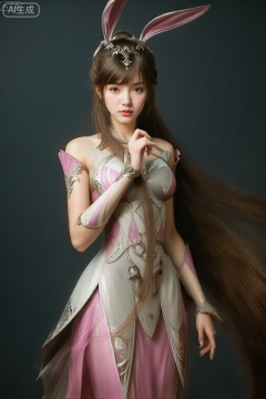 该图像描绘了一个穿着精致的奇幻服装的人。服装以银色为主,具有复杂的图案和设计,混合了金属和织物元素。该服装包括带有护肩和护臂的合身紧身胸衣,以及带有银色点缀的粉红色飘逸裙子。这个人有一头长而直的棕色头发,从背上垂下来,戴着一条带有大粉色兔子耳朵的发带,戴着一顶装饰性的银色头饰。