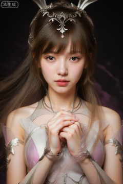 图像显示一位年轻女子,有着浅棕色的长直发。她戴着一顶饰有复杂银色图案和翅膀状小装饰品的头饰。她的头发被设计成有些发丝自由垂落,而另一些发丝则塞在耳后。她有着精致、空灵的外表,苍白的肤色和一双富有表情的大眼睛。她的嘴唇被涂成柔和的粉红色。 她穿着轻薄的半透明服装,肩膀上有透明的翅膀状织物细节。这套服装饰有银色臂带,设计华丽、流畅。她双手合十放在胸前,手指轻轻交扣。脖子上戴着一条细细的银色项链,显得整体精致优雅。背景为深色,带有微妙、抽象的紫色和粉色色调,有助于突出她的身材以及服装和配饰的复杂细节。图像具有柔和、梦幻的品质。