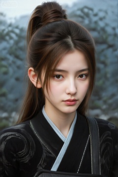 图像描绘了一个人,有一头棕色长发,扎成一个高高的、整齐的发髻,几缕松散的发丝勾勒出脸庞。头发光滑有光泽,具有自然光泽。此人肤色白皙,穿着深色(可能是黑色)传统服装,肩膀和袖子上有复杂的银色或灰色图案。这件衣服的领子处有一个浅蓝色的内衬。背景是模糊的自然景观,有树木和山区,给场景带来一种宁静而有些空灵的氛围。整体构图以人物为中心,背景提供柔和、互补的对比。
