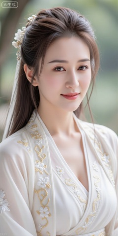 Exquisite,romantic ancient style,hyper-realistic human,beauty portrait,world-shocking beauty,pure desire,a smile that captivates the city,flowing brown-gray hair,sharp eyes,rosy cheeks,hanfu,elegant clothing,white embroidered sheer dress,intricate gold threads,ethereal atmosphere,skillfully capturing emotions,masterpiece,soft lighting,high resolution,depth of field composition,layers.