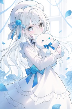 1girl,dress,solo,bear ears,white dress,heterochromia,ribbon,long sleeves,long hair,blue eyes,flower,white hair,white headwear,looking at viewer,rose,blue flower,blue ribbon,hair ribbon,stuffed animal,blush,stuffed toy,petals,grey eyes,animal ears,blue rose,hat,hair ornament,holding,frills,teddy bear,hair between eyes,