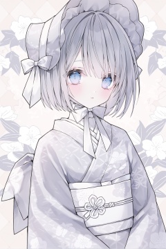 1girl, solo, blue eyes, japanese clothes, kimono, bonnet, looking at viewer, grey hair, blush, upper body, sash, short hair, wide sleeves, parted lips, bow, floral print, long sleeves, white bow, obi, grey kimono