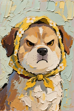 油画,梵高风格作品,欧美艺术插画,绘本插画,一只戴着黄色花头巾的小狗,笔触细腻,油画笔触明显,写意,极简,猫咪的脸圆嘟嘟,表情严肃,好像在生气,超近景手绘插图,Q版。,Scraper thick - painted oil painting style