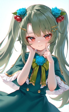 masterpiece,very aware,highres,absurdres,newest,best quality,loli,petite,high quality,chromatic_aberration,cinematic_angle,dutch angle,//,1girl,solo,long hair,looking at viewer,blush,smile,bangs,hair ornament,red eyes,white background,dress,bow,ribbon,animal ears,twintails,closed mouth,hair ribbon,flower,frills,food,green hair,hairclip,hands up,capelet,fruit,rose,index finger raised,hand on own face,green bow,blue flower,green dress,hand on own cheek,food-themed hair ornament,blue rose,cherry,green capelet,cherry hair ornament,<lora:Komachan:0.9>,