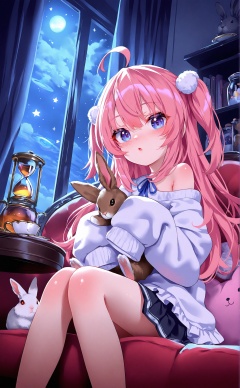 masterpiece,very aware,highres,absurdres,newest,best quality,loli,petite,high quality,chromatic_aberration,cinematic_angle,dutch angle,//,1girl,moon,animal ears,solo,window,star (symbol),full moon,sleeves past wrists,couch,stuffed toy,pink hair,star (sky),looking at viewer,long hair,rabbit ears,sky,skirt,sleeves past fingers,sitting,hair ornament,rabbit,night,jar,stuffed animal,curtains,ahoge,teapot,on couch,indoors,night sky,long sleeves,jacket,feet out of frame,purple eyes,cushion,cup,starry sky,book,cloud,blue eyes,:o,holding,teacup,stuffed rabbit,frills,frilled skirt,bookshelf,open mouth,table,pom pom hair ornament,hourglass,off shoulder,black skirt,pillow,holding stuffed toy,virtual youtuber,shirt,blush,pom pom (clothes),planet,parted lips,pleated skirt,dress,white jacket,jewelry,rabbit girl,twintails,lamp,rabbit hair ornament,ufo,sidelocks,two side up,white shirt,ribbon,<lora:Komachan:1>,