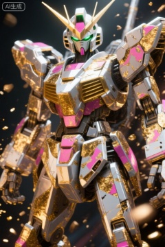 这是一幅高度细致的CGI图像,描绘了一个未来主义的人形机甲机器人,处于动态且准备战斗的姿势。机器人拥有金属质感的银白色机身,点缀着鲜艳的粉色和金色装饰。它的头部有绿色发光的眼睛和显眼的金色V形饰冠。机甲的胸部覆盖着金色肋状护甲板,四肢结实且带有精致的金色细节。周围悬浮着金色粒子,增加了运动感和能量感。背景为深色,使机器人的亮色和金属质感更加突出。整体风格让人联想到日本机甲动漫,兼具高度逼真感和复杂设计。