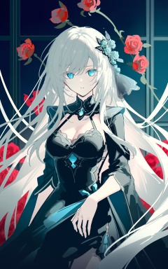 1girl,solo,dress,flower,blue eyes,breasts,black dress,long hair,hair ornament,cleavage,looking at viewer,rose,very long hair,