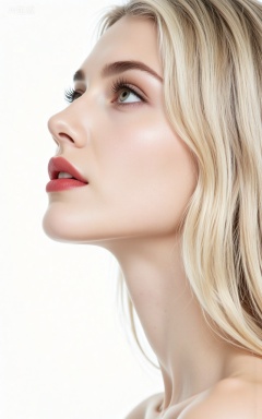 1girl, solo, realistic, blonde hair, white background, lips, portrait, parted lips, simple background, long hair, looking up, red lips, nose, eyelashes, makeup, grey eyes, green eyes, from side, close-up,