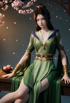 (looking at viewer:1.1),upper body,(moody lighting:1.1),peach blossom,falling petals,(large breasts:0.8),liuyu,1girl,solo,black hair,hair ornament,long hair,green dress,realistic,dress,chinese clothes,closed mouth,jewelry,bracelet,sash,hair bun,brown eyes,clothing cutout,barefoot BREAK masterpiece,(best quality),(intricate details:0.9),(realistic skin:1.2),<lora:QQSillliuyuV1:0.8>,