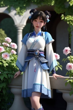 (Leaning against a wrought-iron gate in a blooming garden, she embodies the allure of a secret paradise:1.2),looking at viewer,<lora:XL16神国之上宁小龄:0.85>,preteen girl,white dress,blue bolero,black hair,braid,double bun,hair ornament,jewelry,sash,necklace,socks,boots,(large breasts:1.2),tree,flower,pink_flower,water,stone,flowers_Surrounded,pondel,, score_9,score_8_up,score_7_up,score_6_up,score_5_up,score_4_up,3d rendering,tag1,tag2, Cinematic Lighting,backlighting,