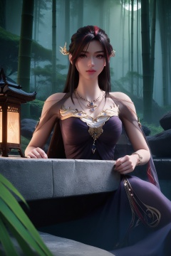 (Seated on a stone bench in a sun-drenched garden, she reads a book, her mind immersed in another world:1.2),looking at viewer,<lora:XL16神国之上赵襄儿黑纱:0.85>,miss zhaoxianger,black corset gown,brown eyes,black hair,red streaked hair,very long hair,hair ornament,jewelry,(large breasts:1.2),bamboo forest,water,stone,pondel,, score_9,score_8_up,score_7_up,score_6_up,score_5_up,score_4_up,3d rendering,tag1,tag2, Cinematic Lighting,backlighting,