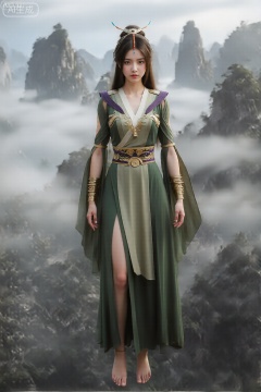 图像描绘了一个人站在一片薄雾缭绕的山地景观前,背景中是高耸的锯齿状山峰。来人身穿一件淡雅的绿色长裙,左侧开叉高,露出部分腿部。这件衣服的内层是白色的,胸部饰有复杂的金色刺绣。裙子的肩部覆盖着绿色布料,一直延伸到手臂上。此人腰间还系着一条华丽的宽腰带,腰带上有金色细节。手腕上,有着多个金色臂镯。头发又长又黑又直,并配有装饰性头饰,其中包括白色元素和两个蓝色流苏。这个人赤着脚,整体外观是一种传统或幻想风格的角色,背景是自然、空灵的。