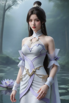 该图像描绘了一位年轻女子站在宁静、雾气弥漫的环境中,就像一个被郁郁葱葱的绿色植物包围的宁静的湖泊或池塘。她穿着一件优雅、合身的白色和淡紫色连衣裙,带有复杂的金色和紫色细节。这件连衣裙采用带锁孔开口的高领设计,饰有华丽的金色装饰和精致的花卉图案。她的黑色长发梳成光滑的高发髻,并用带有花卉图案的银色头饰固定。她额头上有一个红色的小宾迪,戴着长长的、悬垂的耳环。背景包括柔软、失焦的树木和靠近水边的一朵盛开的大莲花,增强了场景的空灵和宁静的氛围