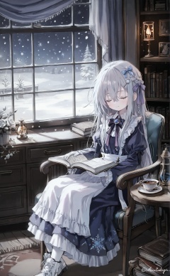masterpiece,absurdres,best quality,loli,petite,high quality,chromatic_aberration,//,1girl, fireplace, book, candle, white flower, long hair, flower, fire, candlestand, snow, window, dress, white rose, phonograph, white footwear, solo, armchair, sitting, rose, long sleeves, puffy sleeves, closed eyes, chair, indoors, vase, juliet sleeves, frills, cup, open book, white hair, apron, teacup, bow, snowing, watermark, curtains, hair bow, closed mouth, frilled dress, white apron, saucer, on chair, winter, teapot, night, very long hair, book stack, smile, boots, puffy long sleeves, ribbon, burning, sleeping upright, grey hair, holding, sample watermark, dutch angle, table, plant, frilled apron, white dress, braid, blue dress, chest of drawers, black bow, rug, artist name, sleeping, cabinet, lamp, hair ornament, clock, snowflakes, blue bow, blush, purple bow, frilled sleeves, facing viewer, hair ribbon, bookshelf, drawer, carpet, purple ribbon, hair flower, shoes, neck ribbon, black dress, sidelocks, holding saucer, long dress, signature, hair between eyes, collared dress, black ribbon, twitter username, potted plant, holding book, hourglass, white gloves, lolita fashion, gloves, desk, lantern, artist logo, tea, layered sleeves, snowman, bowtie, puffy short sleeves, white pantyhose, maid, layered dress, plaid, reading, bookmark, eyebrows hidden by hair, feet out of frame, desk lamp, pantyhose, purple dress, tree, open window, ice, light smile, shirt, picture frame, holding cup, plate<lora:Nano_渡コキュー:0.8>,