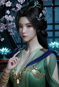 (looking at viewer:1.1),upper body,(Dark room:1.3),(moody lighting:1.1),peach blossom,falling petals,(large breasts:0.8),hanyunzhi,1girl,solo,black hair,long hair,hair ornament,green dress,realistic,dress,closed mouth,jewelry,bracelet,chinese clothes,sash,expressionless,brown eyes,hair bun BREAK masterpiece,(best quality),(intricate details:0.9),(realistic skin:1.2),<lora:QQSillhanyunzhiV1:0.8>,