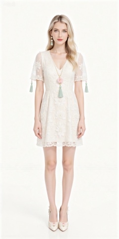 high heels, white background, 1girl, white footwear, solo, dress,simple background, standing, flower, legs, tiptoes, pink flower, close-up, tassel, shoes, floral print, feet,
