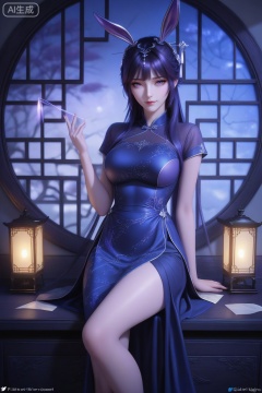 Young woman, (deep indigo cheongsam with silver thread constellations:1.3), standing by a river-facing window in an old study:1.2), one hand tracing calligraphy on rice paper, (lantern light casting shadows of ancient ink brushes:1.1), (hair in a high bun with an ivory hair stick:1.1), blurred view of lantern boats on the water outside, warm candlelight ambiance,