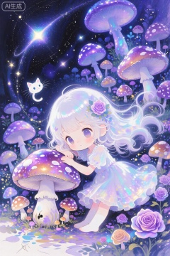 dmt art style,(a white chibi cute girl:1.3),(Dense mushrooms, of different heights, will shine:1.1),The girl leaned against the mushroom,Gleaming mushrooms,illusion,(catling:1.1),colorful,purple,blue,rose hermosa,Dream scene,