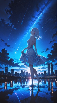 masterpiece,absurdres,best quality,high quality,chromatic_aberration,Night,darkness,black theme,shy,embarrass,endured_face,nsfw,//,completely_nude,back,//,1girl,sky,night,solo,dress,star (sky),night sky,starry sky,shooting star,white dress,outdoors,water,scenery,skyline,skirt hold,looking up,wading,city lights,cityscape,standing,cloud,short hair,reflection,blue eyes,city,barefoot,blue theme,white hair,bare shoulders,breasts,building,cloudy sky,sleeveless dress,ocean,skyscraper,sleeveless,horizon,medium breasts,closed mouth,standing on liquid,from side,medium hair,walking,long hair,profile,reflective water,walking on liquid,//,potorealistic,((Artist:na-ga)),artist:luvluvvox,artist:fukai ryosuke,[artist:Torino aqua],artist:minato hitori,hiten_(hitenkei),artist:rurudo,artist:lazuri7,artist:yunikon,artist:ramchi,(courreges_ace),//,highres,HDR,8K,high contrast,illustration,depth of field,(colorful),Tyndall effect,contrast,lens flare,