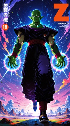 (masterpiece, best quality:1.2),Piccolo,dragon ball,1boy,male focus,solo,A shot with tension,(Visual impact,giving the poster a dynamic and visually striking appearance:1.2),impactful picture,(masterpiece, best quality:1.2),offcial art,colorful,splash of color,movie perspective,advertising style,magazine cover,a photograph of Piccolo from Dragon Ball Z,dressed in night clothes,