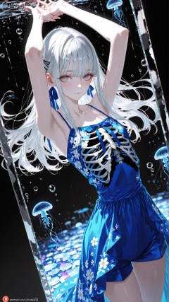 1girl,solo,long hair,looking at viewer,blush,bangs,dress,ribbon,closed mouth,collarbone,white hair,cowboy shot,shorts,arms up,grey eyes,floral print,blue ribbon,black background,bubble,ribs,skeleton,bone,jellyfish,glass,clear glass,broken glass,,(artist:quasarcake:0.8),extreme aesthetic,(wlop:0.6),honjou honjou raita,lack,rella,wanke,raita,masterpiece,best quality,good quality,newest,year 2024,year 2023,very aesthetic,absurdres,Visual impact,A shot with tension,ultra-high resolution,32K UHD,sharp focus,best-quality,masterpiece,Emotionalization,unconventional supreme masterpiece,masterful details,temperate atmosphere,with a high-end texture,in the style of fashion photography,(Visual impact:1.2),giving the poster a dynamic and visually striking appearance,impactful picture,offcial art,colorful,movie perspective,masterpiece,best quality,amazing quality,very aesthetic,absurdres,best quality,newest,dynamic_angle,cinematic_angle,dutch angle,foreshortening,