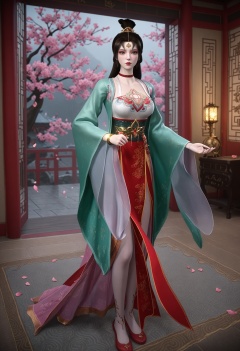 (standing full_body:1.1),(looking at viewer:1.1),masterpiece,(best quality),smog,Dark room,dim lighting,peach blossom,falling petals,<lora:YQ_Illustrious光辉v5_墨云_V1:0.8>,q1528437228,1girl,solo,black hair,long hair,choker,red choker,hair ornament,dress,chinese clothes,long sleeves,jewelry,forehead mark,bracelet,wide sleeves,hair bun,brown hair,mole under eye,brown eyes,eyeshadow,red footwear,