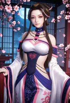 (cowboy shot:1.1),(looking at viewer:1.1),masterpiece,(best quality),smog,Dark room,dim lighting,peach blossom,falling petals,<lora:YQ_Illustrious光辉v5_湘夫人_V1:0.8>,q1528437228,1girl,solo,long hair,black hair,jewelry,bare shoulders,necklace,hair ornament,brown hair,dress,sidelocks,wide sleeves,long sleeves,choker,hair bun,brown eyes,detached sleeves,grey eyes,blue eyes,