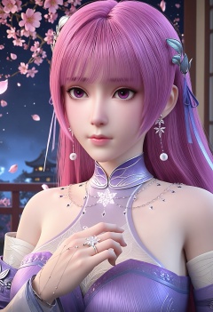 (upper_body:1.2),(looking at viewer:1.1),masterpiece,(best quality),smog,Dark room,dim lighting,peach blossom,falling petals,<lora:YQ_Illustrious光辉v5_叶紫芸_V1:0.8>,q1528437228,1girl,solo,long hair,hair ornament,jewelry,chinese clothes,dress,earrings,pink hair,purple hair,purple eyes,detached sleeves,blunt bangs,pantyhose,thighhighs,pink eyes,ribbon,wide sleeves,hair ribbon,very long hair,necklace,ring,see-through,shoes,