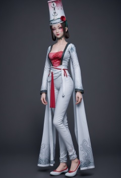 (standing full_body:1.1),(looking at viewer:1.1),facing viewer,direct gaze,<lora:YQ_pony_baiwuchang_changxuanlin_V4:0.8>,q1528437228,1girl,solo,black hair,hat,hair flower,makeup,chinese clothes,dress,hair ornament,long sleeves,grey eyes,blue eyes,facepaint,hair rings,eyeshadow,pants,jewelry,headwear,long hair,facial mark,short hair,brown hair,shoes,BREAK simple background,pure black background,black background,perfect anatomy,
