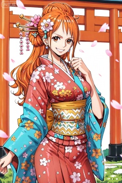 1girl,hair ornament,solo,orange hair,japanese clothes,nami \(one piece\),kimono,smile,earrings,jewelry,flower,looking at viewer,hair flower,hair stick,orange eyes,brown eyes,floral print,hair bun,