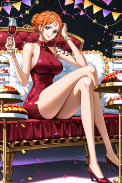 1girl, nami \(one piece\), orange hair, solo, dress, high heels, breasts, red dress, jewelry, cup, crossed legs, bracelet, sitting, drinking glass, smile, sleeveless, holding, sleeveless dress, looking at viewer, large breasts, food, wine glass, cake, brown eyes, tattoo, holding cup, legs, earrings, short dress, bangle, hair bun, long legs, full body, pillow, red footwear