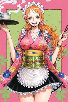 1girl, solo, japanese clothes, kimono, jewelry, nami \(one piece\), maid headdress, floral print, earrings, orange hair, holding, smile, breasts, frills, long hair, open mouth, maid, apron, looking at viewer, bracelet, sash, skirt, holding tray, large breasts, hair ornament, obi, flower, tray, frilled apron, brown eyes, wa maid, pearl earrings, white apron, cowboy shot, wide sleeves, frilled skirt, border, short kimono, black skirt, chopsticks, maid apron, hair flower, waist apron, teeth, print kimono, :d, pink kimono, standing