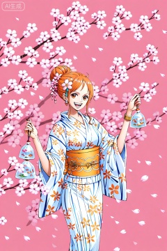 1girl, nami \(one piece\), kimono, japanese clothes, orange hair, solo, smile, flower, open mouth, cherry blossoms, hair ornament, orange eyes, pink background, holding, hair flower, sash, looking at viewer, yukata, jewelry, white kimono, hair bun, standing, bag, :d, bracelet, obi, wide sleeves, fish, floral print, short hair, petals, teeth, print kimono