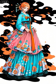 1girl, solo, orange hair, korean clothes, hanbok, hair ornament, simple background, white background, full body, smile, nami \(one piece\), dress, long sleeves, single hair bun, hair bun, standing, looking at viewer, hair stick, skirt hold