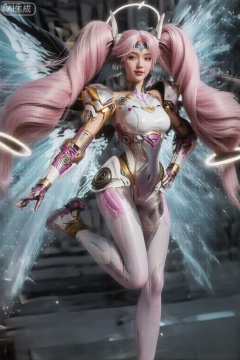 她有一头飘逸的粉红色长发,扎成双马尾辫,每根马尾辫的末端都有一圈光环。她的服装是一套合身的未来派盔甲套装,融合了白色、粉色和金色元素。该套装配有各种机械和金属部件,包括护臂、护腿和设计复杂的胸甲。她有巨大的白色翅膀,黑色的尖端从她的背部延伸出来,她周围有灯光效果,给人一种动感和活力的感觉。她的右腿抬起,她似乎在半空中,一只手向前伸出,另一只手放在臀部。