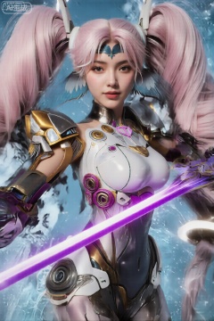 该图像描绘了一个充满活力、以动作为导向的姿势的女性角色。她有一头浅粉色的长发,扎成两条高高的辫子,每条辫子都用白色的发带固定着。她的面部表情平静而专注,淡粉色的嘴唇带着一丝微笑。她穿着合身的白色和金色装甲套装,设计复杂,包括粉色和金色的圆形和螺旋图案。盔甲上有金属元素的细节,看起来很高科技。 在她的左臂上,有一个黑色和紫色的大型机械手套,带有金色装饰和发光的紫色眼睛状特征。她的右臂上有一个类似但较小的机械手套。她右手握着一把散发着紫色光芒的长剑,长剑向外伸出。背景是蓝色的天空,带有光、星状粒子,右侧有圆形光效果。