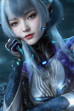 该人物拥有苍白、光滑、明亮的皮肤,以及引人注目的大眼睛,带有柔和的蓝色色调。人物的头发又长又直,呈银白色,垂落在肩膀上。该人物穿着时尚、合身的金属套装,似乎是由高级材料制成的,具有高领和发光的蓝色线条和节点的复杂图案。该套装具有反光、几乎液体状的表面,并嵌入灯光,赋予其高科技外观。人物姿势轻松,一只手轻轻触碰下巴,表现出若有所思或沉思的表情。背景是一个充满星星的宇宙空间,带有深蓝色和紫色,增强了图像的未来主义和超凡脱俗的氛围。