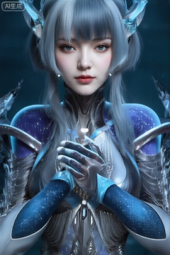 该图像展示了一个具有空灵、超凡脱俗的外观的人物。这个角色有一头飘逸的银色长发,从背上垂下来,带有微妙的发光亮点,给人一种冰冷的感觉。他们的眼睛很大,表情丰富,呈引人注目的蓝色,与苍白的肤色形成鲜明对比。五官精致匀称,小嘴涂着柔和的红色调,精致而精致。 该人物穿着合身的金属套装,似乎是由反光水晶材料制成的。该套装具有复杂的棱角设计和从肩膀延伸出来的锋利的翼状突起,增添了角色的气势和威严。套装的胸部区域有一个突出的几何图案,可以捕捉光线,增强整体的超凡脱俗感。 角色的双手在身前握在一起,手指交叉,做出一种暗示沉思或崇敬的姿势。手套光滑且具有金属质感,与套装的其他部分相匹配,并具有光滑、抛光的表面。 背景是深蓝色,带有类似雪花或冰晶的微妙发光颗粒,增强了寒冷、神秘的气氛。整体构图以人物为中心,将观者的注意力吸引到其平静而有力的神态上。灯光柔和但引人注目,突出了金属表面和人物精致的特征,营造出深度和维度感。图像散发出一种平静的力量和超凡脱俗的美感。